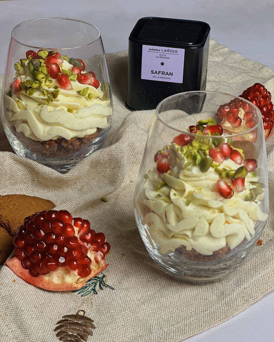 Forkæl smagsløgene i juletiden med en dessert, der kombinerer sprød brunkage crumble og cremet safrancreme, toppet med knasende pistacier og syrlige granatæblekerner. Den varme, gyldne safran giver cremen en aromatisk dybde og smuk farve, mens brunkagen tilføjer krydret crunch, der balancerer den bløde flødeost. Med sine lag af smag og farve er denne dessert både festlig og uimodståelig - ideel til at skabe lidt ekstra julestemning på dessertbordet.
