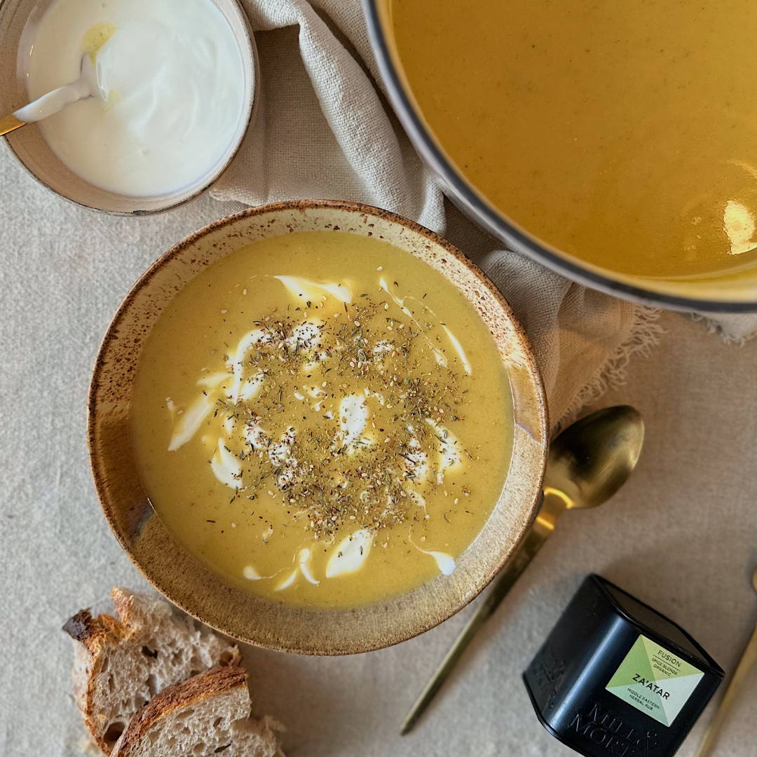 Spis suppen med cremefraiche, et drys Za'atar og et godt stykke brød.