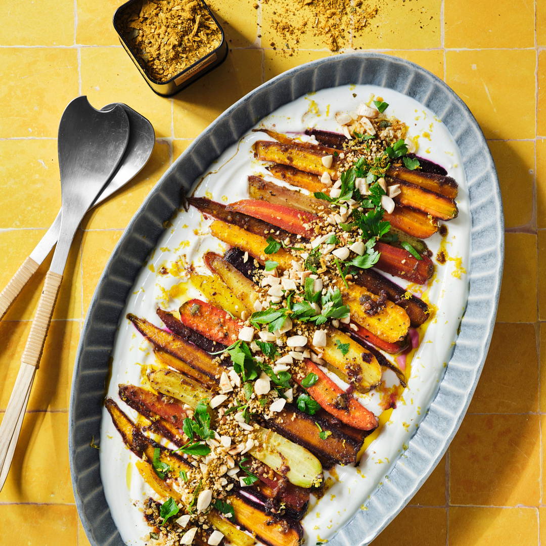 Når gulerødderne lægges på en frisk bund af citronyoghurt og toppes med en sprød blanding af mandler, panko og endnu et strejf Vadouvan, får du en ret, der kombinerer smag, tekstur og farve på bedste vis, og som både er smuk at servere og skøn at spise. Retten er oplagt som tilbehør til en middag eller som en farverig vegetarret i sig selv.