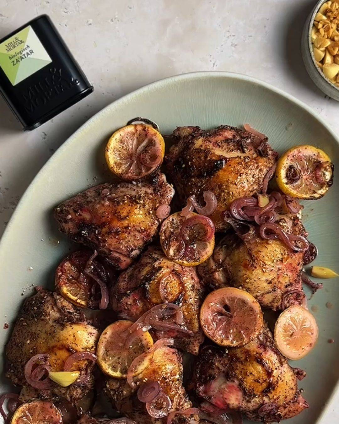 Læg kylling, løg og citroner på et fad. Hæld lidt af stegeskyen over kyllingestykkerne. Drys med ekstra Za’atar, hakket persille og de ristede mandler.